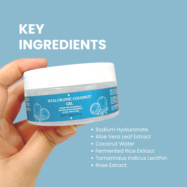 Our premium concoction in Hyaluronic Coconut Gel provides multiple benefits to your hair, skin, nails, and feet! Made with purely natural products like Coconut Water, Aloe Vera Leaf Extract, and Rose Geranium Essential Oil, this gel hydrates, moisturises, lightens and smoothens.